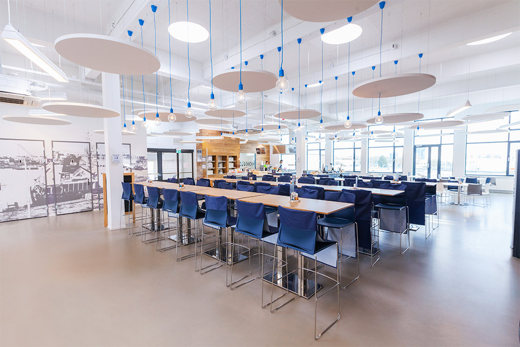 Diverse zones voor stilte of overleg maken de kantine functioneel voor verschillende behoeften.